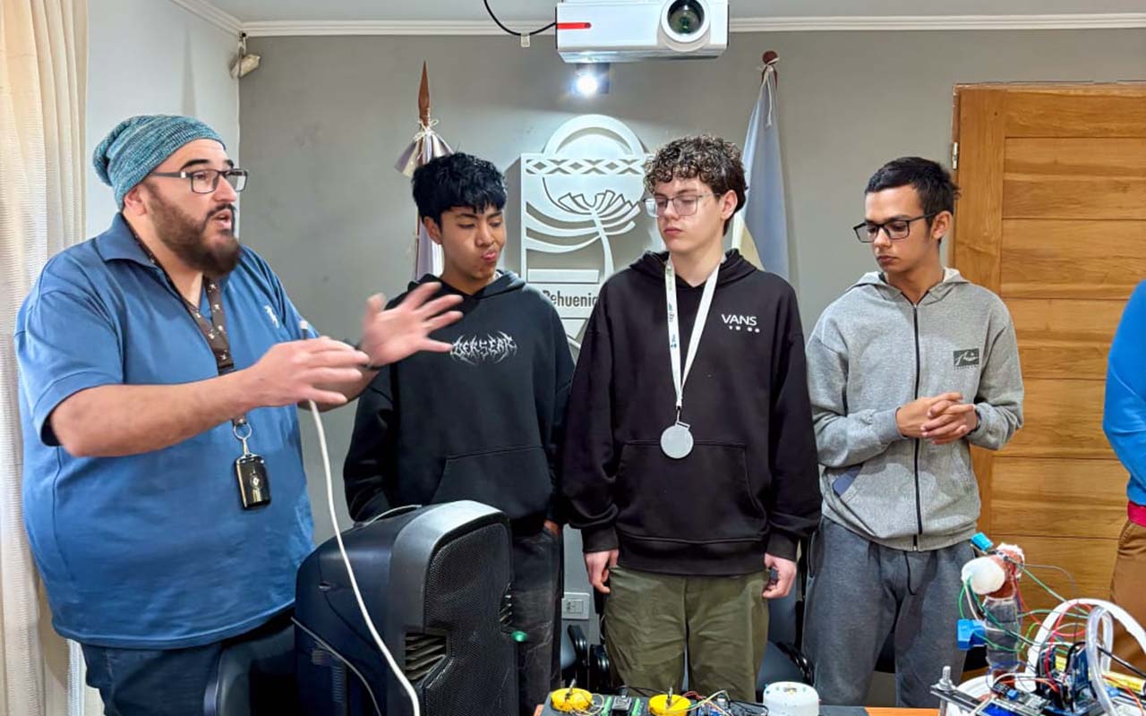 El Intendente municipal Arturo de Gregorio, junto a su equipo y al Presidente del Concejo Deliberante Carlos Quiróz, recibió este viernes 14 de noviembre a todo el equipo de trabajo de 3er año del CPEM 90, quienes presentaron el proyecto ganador de EducaTIC 2025 y también dos prototipos más de temáticas educativas destacadas, “Hilos en Frecuencia” y “Amet Plantis”. Sobre estos proyectos, los estudiantes Alexander Leandro Ñanco, Lorena Daiana Ortiz Barra y Ciro Rothstein Bravo explicaron los objetivos y procesos llevados adelante durante el año escolar