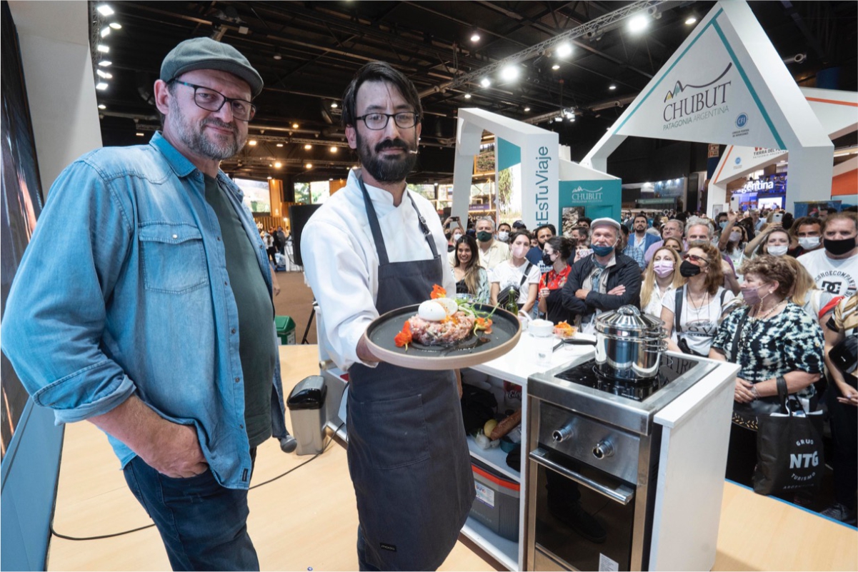 Ante una gran convocatoria de público y medios, el Padrino del Festival del Chef Patagónico, Christophe Krywonis y el chef local, Matías Tesoriero...