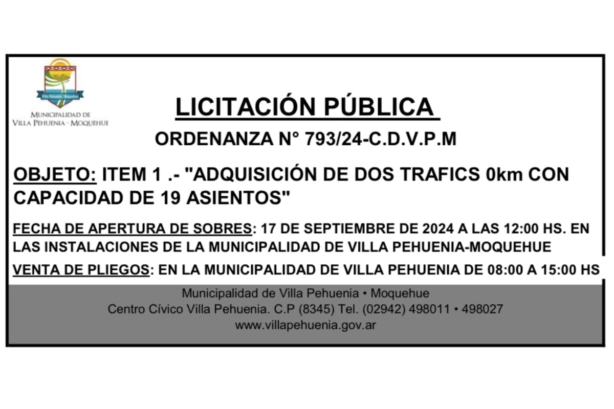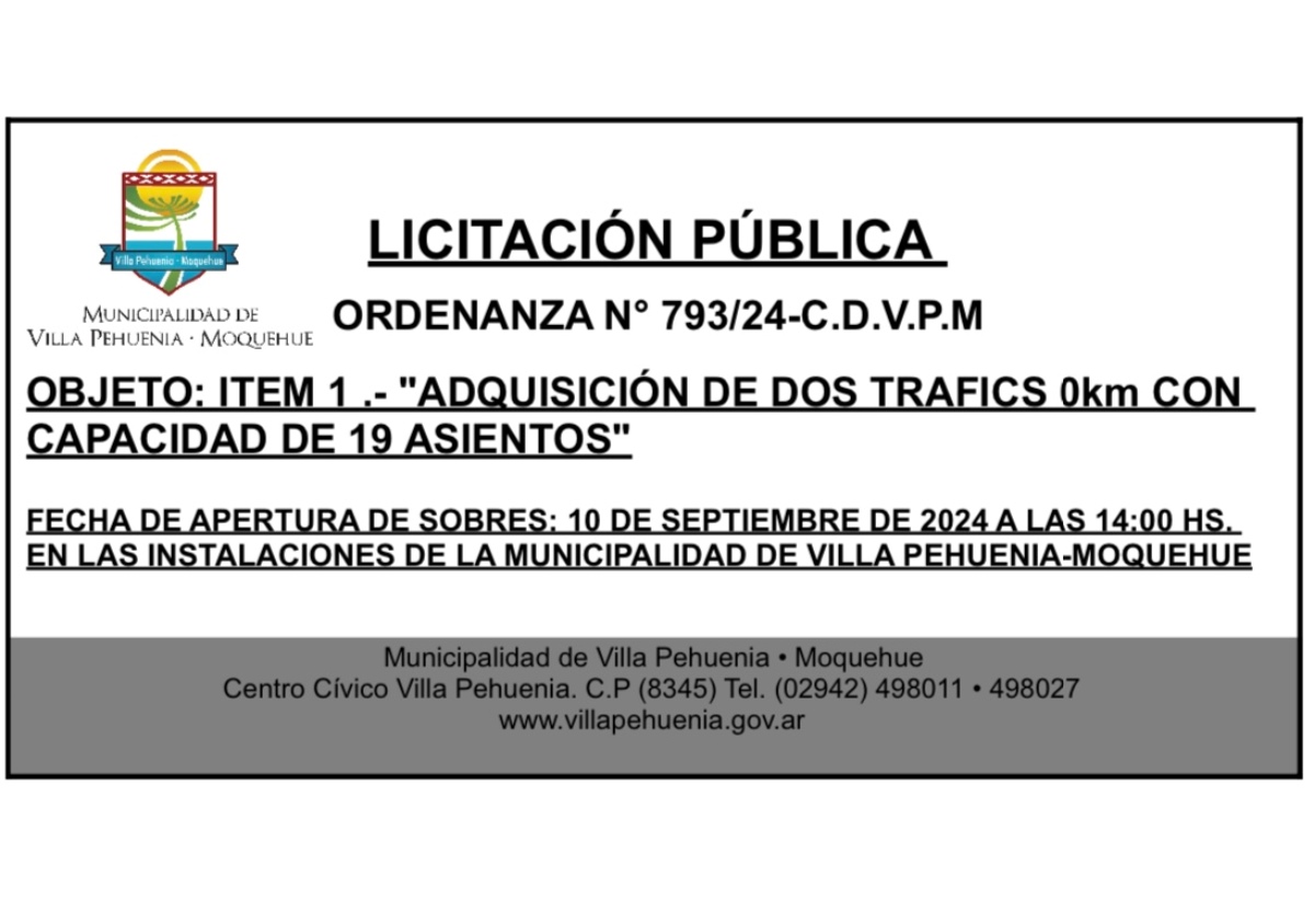 La Municipalidad de Villa Pehuenia Moquehue abre a Licitación Pública según Ordenanza N° 793/2024 para la adquisición de dos vehículos Trafic 0 km...